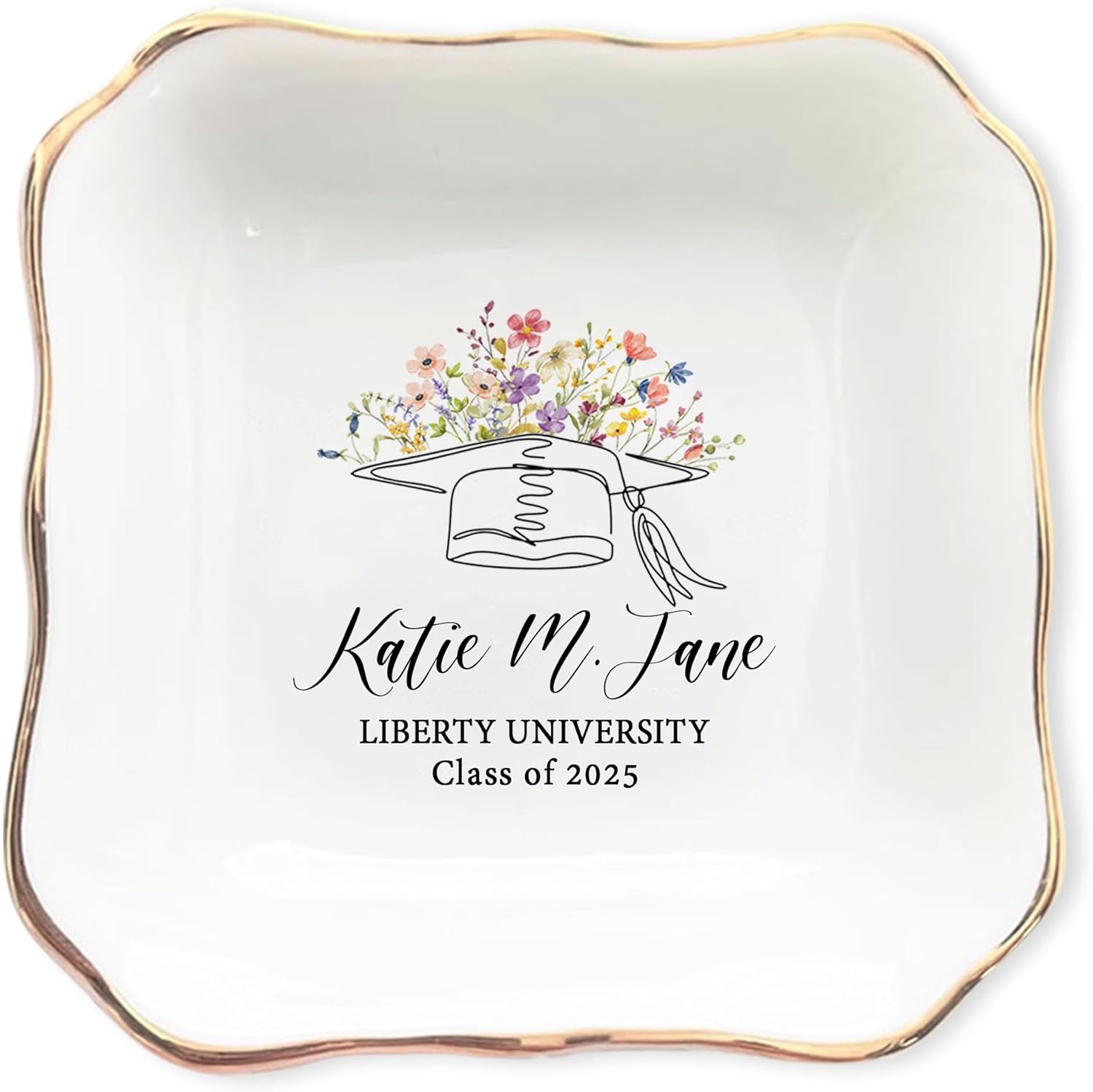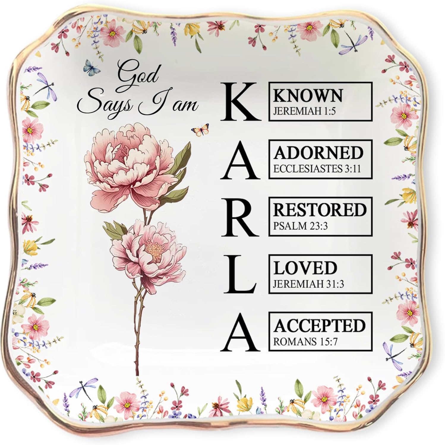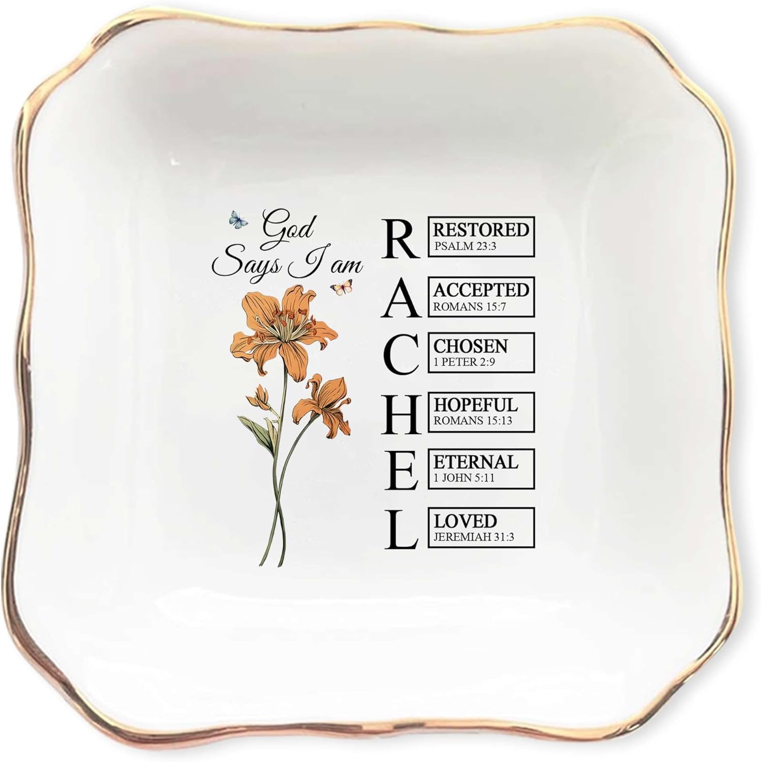 Bring encouragement and faith into everyday life with this beautiful Personalized “God Says I Am” Jewelry Dish. More than just a jewelry holder, this meaningful keepsake is a reminder of identity, strength, and love as spoken in Scripture. Thoughtfully designed around the empowering “God Says I Am” message, each piece highlights timeless Bible verses that affirm who we are in Christ — cherished, chosen, loved, and redeemed. Crafted from delicate porcelain and finished with an elegant gold trim, this dish balances both beauty and practicality. Whether used to hold rings, earrings, necklaces, or small treasures, it also serves as a daily reminder of God’s promises. Each dish can be personalized with the recipient’s name and initial, making it a truly one-of-a-kind gift that reflects their personal faith journey. Available in a variety of shapes — round, square, or heart — this versatile trinket tray complements any nightstand, vanity, or desk. Its design features uplifting words of Scripture that bring comfort and strength with every glance, transforming an everyday item into a treasured symbol of encouragement. This personalized jewelry dish makes a heartfelt gift for daughters, sisters, mothers, grandmothers, or friends of faith. It’s a thoughtful choice for birthdays, baptisms, confirmations, Christmas, or simply as a reminder to someone special that they are loved, valued, and seen through God’s eyes. Whether for personal use or as a cherished gift, the Personalized “God Says I Am” Jewelry Dish is more than an accessory — it’s a daily touchstone of faith, identity, and inspiration that will be treasured for years to come.